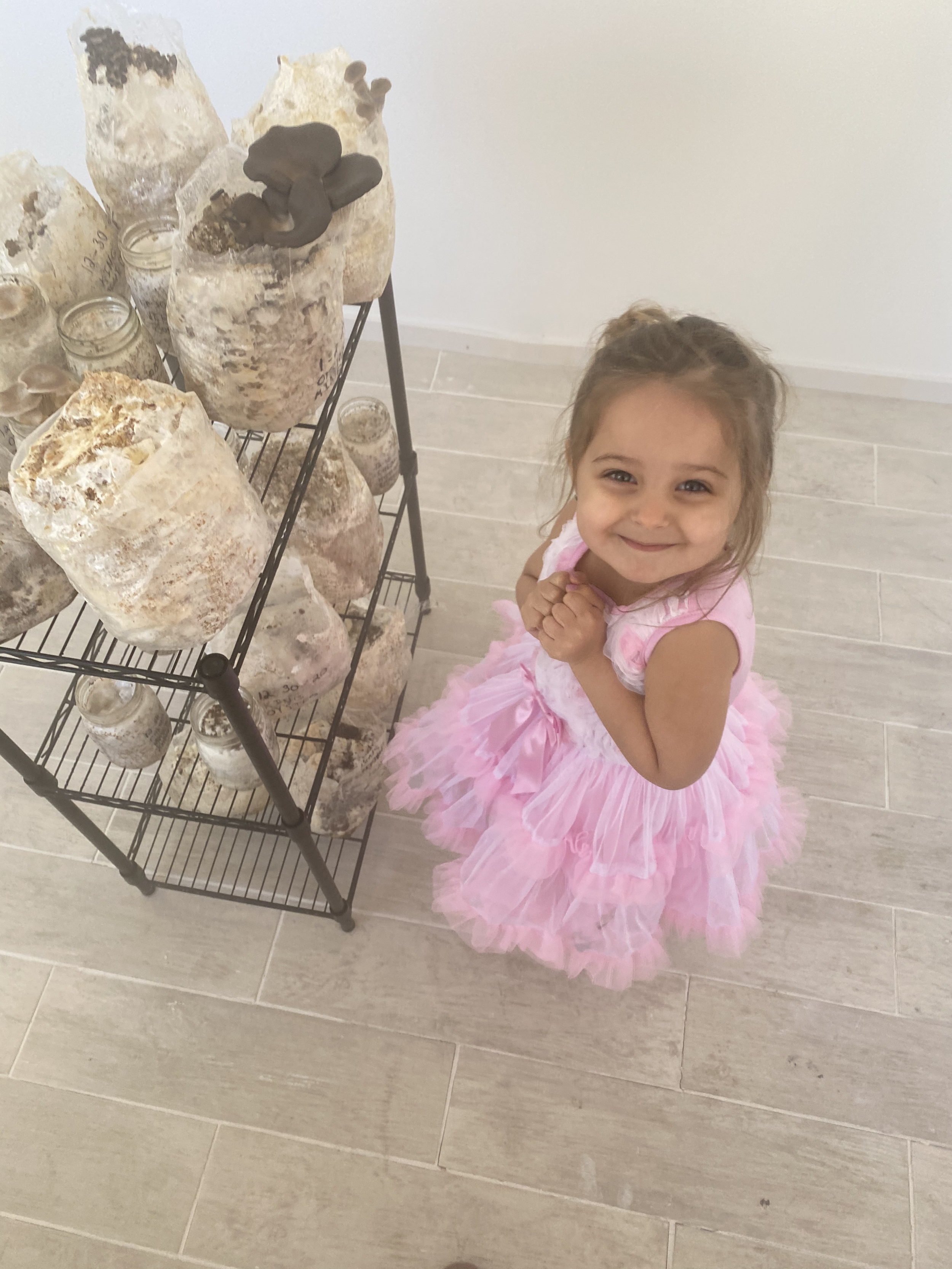 She picks the mushrooms when they are ripe for harvest— here, she was informed & investigating which to go for first.